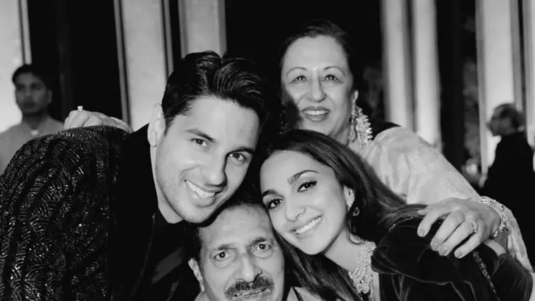 Kiara took to Instagram, where she shared two monochrome pictures. The first featured her along with her father-in-law, husband Sidharth, and mother-in-law. The other photograph just featured her father-in-law.